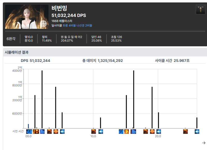 이후 [스킬 분석] 탭에서 직업 및 세팅에 맞는 스킬 구성을 입력하면 1사이클 데미지와 DPS 결과가 하단에 표시됩니다.