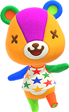 마치 헝겊 인형을 연상시키는 몸의 이음새가 특징인 꼬마곰 주민입니다. 무지개색의 알록달록한 외모와 순수한 먹보 성격이 결합해 많은 플레이어들의 ‘힐링 캐릭터’로 사랑받고 있습니다.