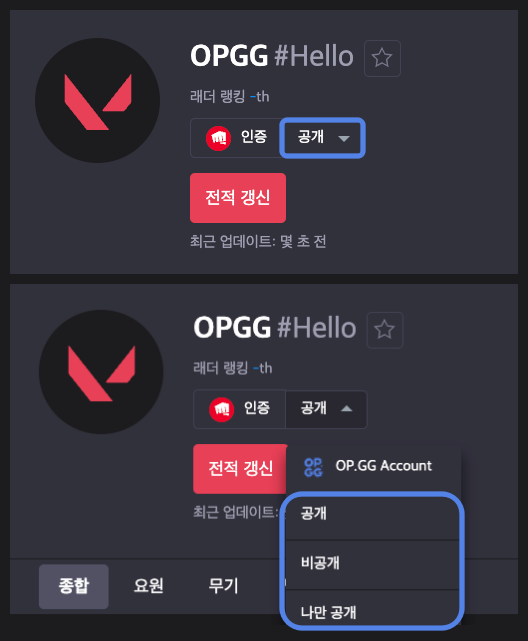 프로필 공개 설정은 모두에게 데이터를 보여줄 수 있는 ‘공개’, 그 누구에게도 보여주지 않는 ‘비공개’, 해당 라이엇 게임즈 계정으로 로그인한 사람에게만 보여지는 ‘나만 공개’로 설정할 수가 있습니다.