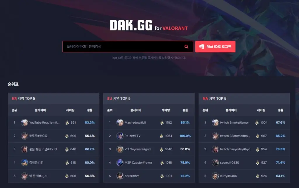 DAK.GG는 발로란트 전적 검색에 최적화된 사이트로 경쟁전 통계를 심층적으로 분석해 제공합니다.