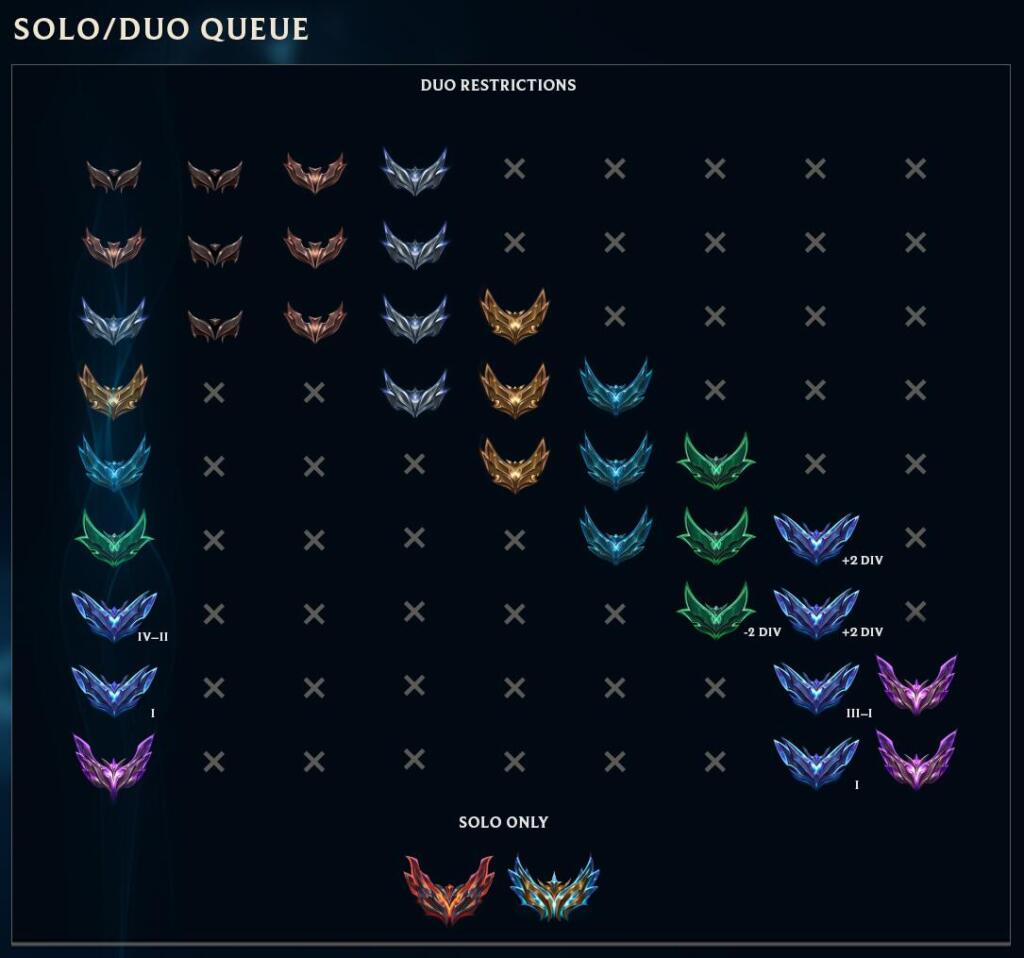 | 마스터 | 다이아몬드 I ~ 마스터와만 듀오 가능 (단, 한국 & 중국 서버는 마스터 MMR 부터 솔로 전용으로, 듀오 불가) |