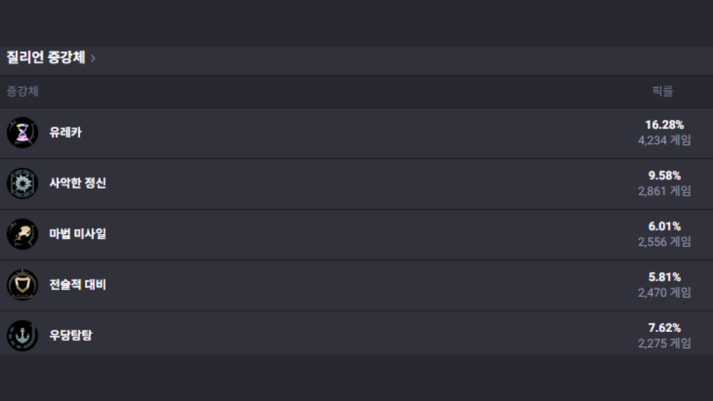 질리언의 증강체는 ‘유레카’ 픽률이 16.28%로 가장 높습니다.