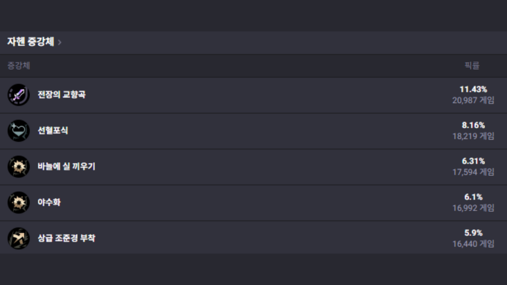 자헨의 증강체는 ‘전장의 교향곡’ 픽률이 11.43%로 가장 높습니다.