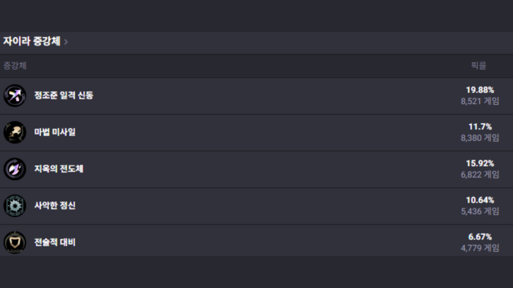 자이라의 증강체는 ‘정조준 일격 신동’ 픽률이 19.88%로 가장 높습니다.