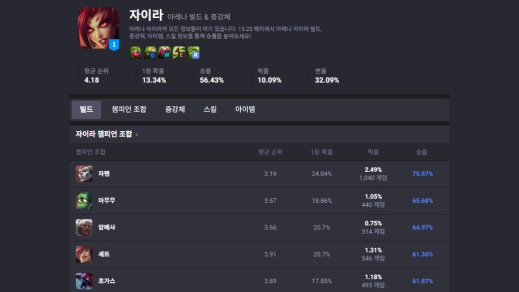 다만 이번 시즌인 2025 롤 아레나에서는 신규 챔피언인 자헨의 출시로 지표에 유의미한 영향을 끼치고 있습니다.