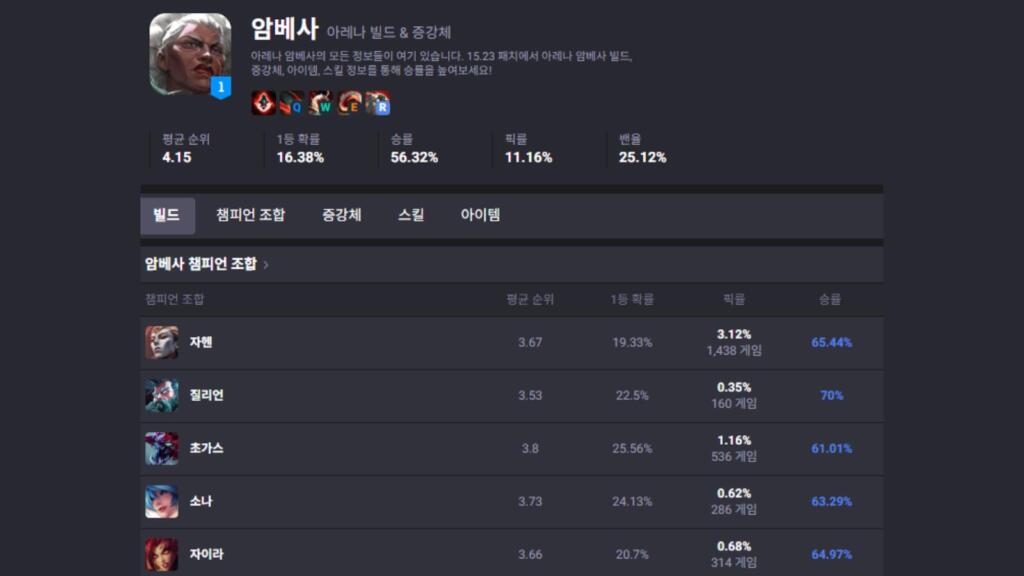암베사의 증강체는 ‘무법자의 투지’ 픽률이 14.94%로 가장 높습니다.