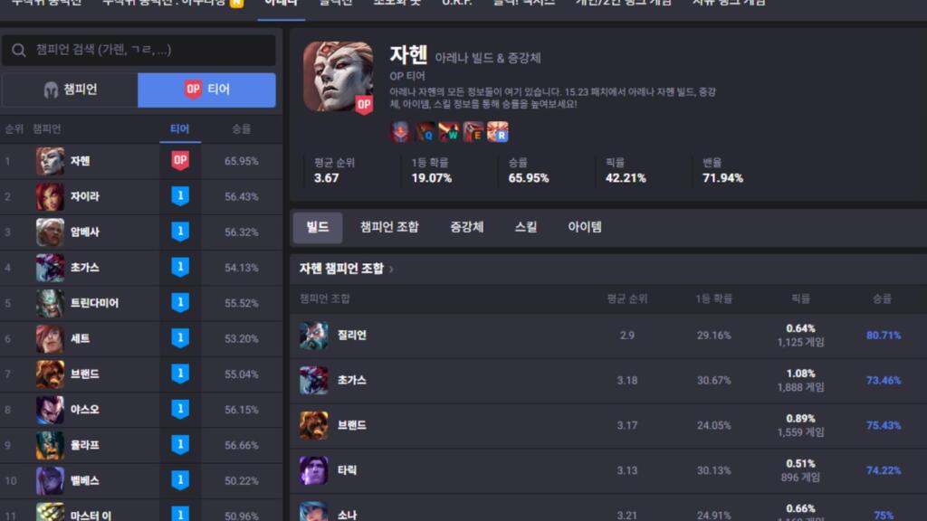 출시되자마자 자헨은 아레나 외 개인/2인 랭크 게임에서도 1티어의 자리를 차지하며 놀라운 입지를 보여주고 있습니다.