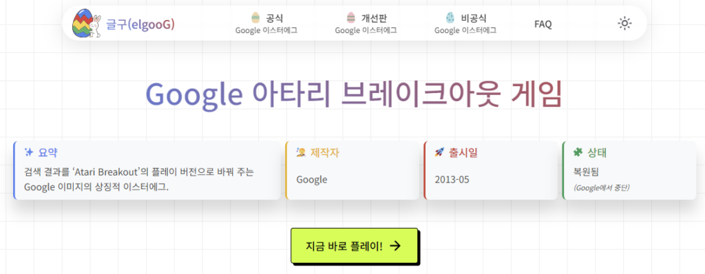 구글의 다양한 이스터에그를 복원하여 모아둔 미러 사이트인 ‘elgooG’을 통해 언제든지 과거와 동일한 환경에서 게임을 즐길 수 있습니다.