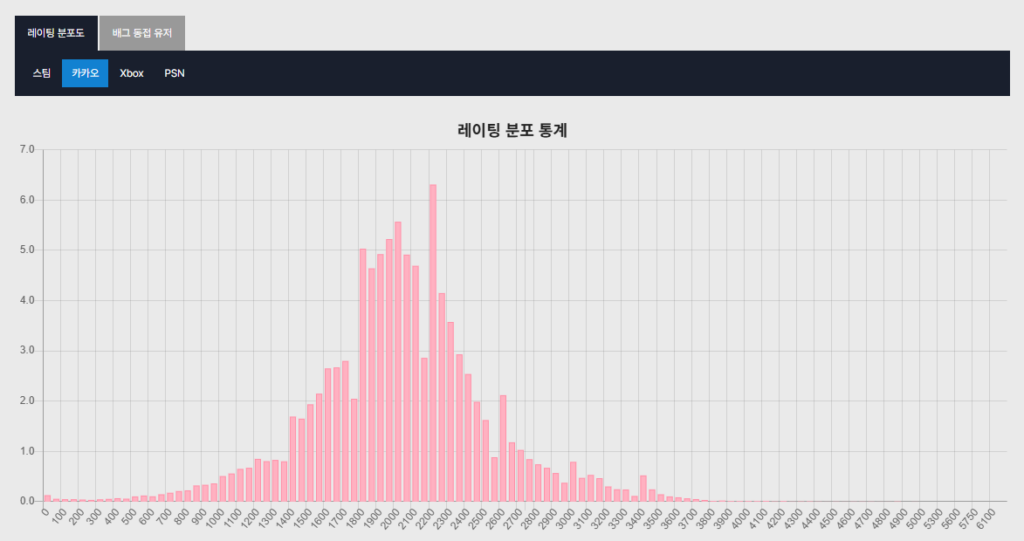 이를 해결하기 위해서, DAK.GG는 카카오배그 전적 검색 간 전체 유저들의 레이팅을 분포도로 표기한 페이지를 제공하고 있습니다.
