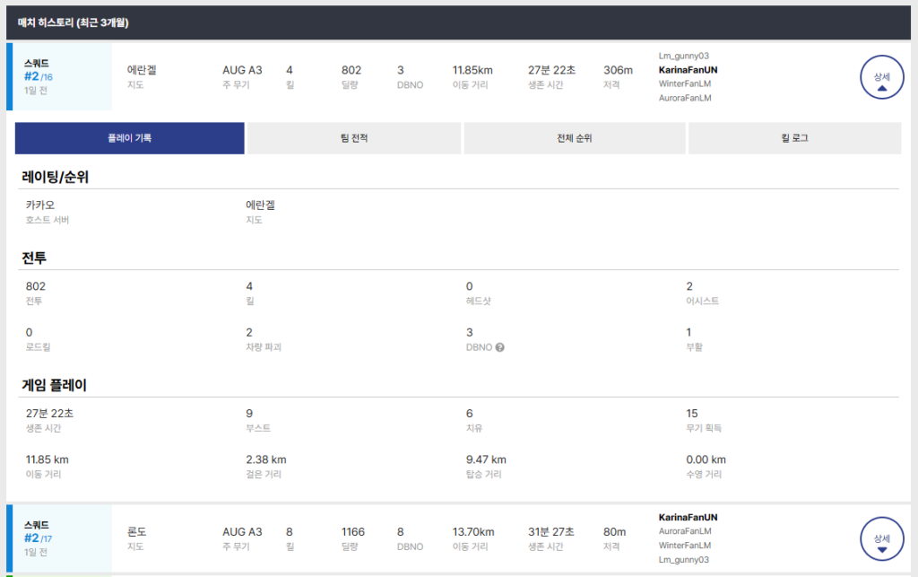각 게임에서 내가 속한 팀의 순위와 킬 수, 총 입힌 데미지 수와 이동 거리를 확인할 수 있는데요.