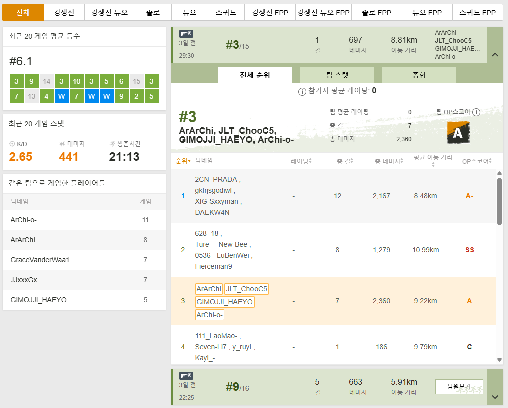 OP.GG 배그에 비해서, 각 게임에서 팀원들의 합산 기록과 개인 기록들을 더욱 디테일하게 알아볼 수 있습니다.