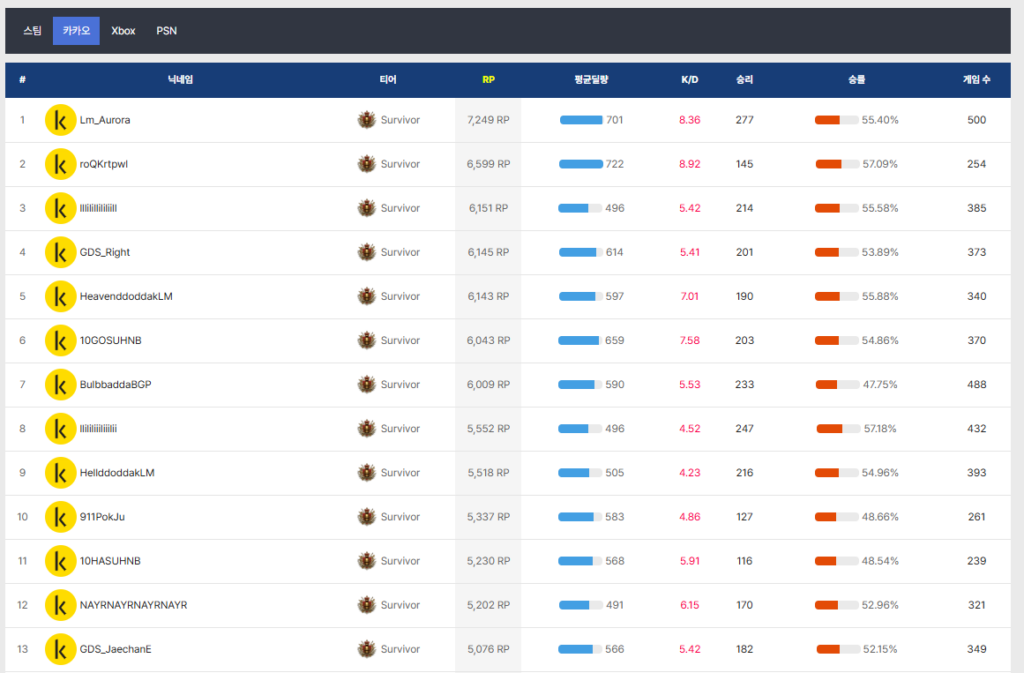 각 플레이어들의 플레이 성향과 점수, 게임 수 등 상위권 랭크를 플레이할 때 만난 플레이어들의 정보를 빠르게 확인하고 싶다면 이 페이지에서 확인할 수 있겠습니다.
