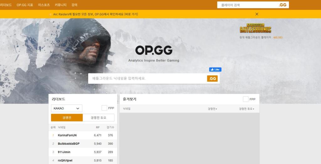 가장 유명한 사이트 중 하나 리그 오브 레전드의 전적 검색도 제공하는 사이트인 op.gg의 배틀그라운드 전적 검색 서비스, op.gg 배그입니다.